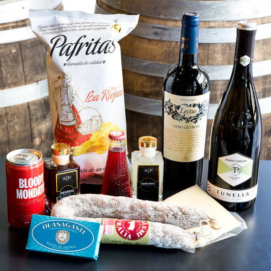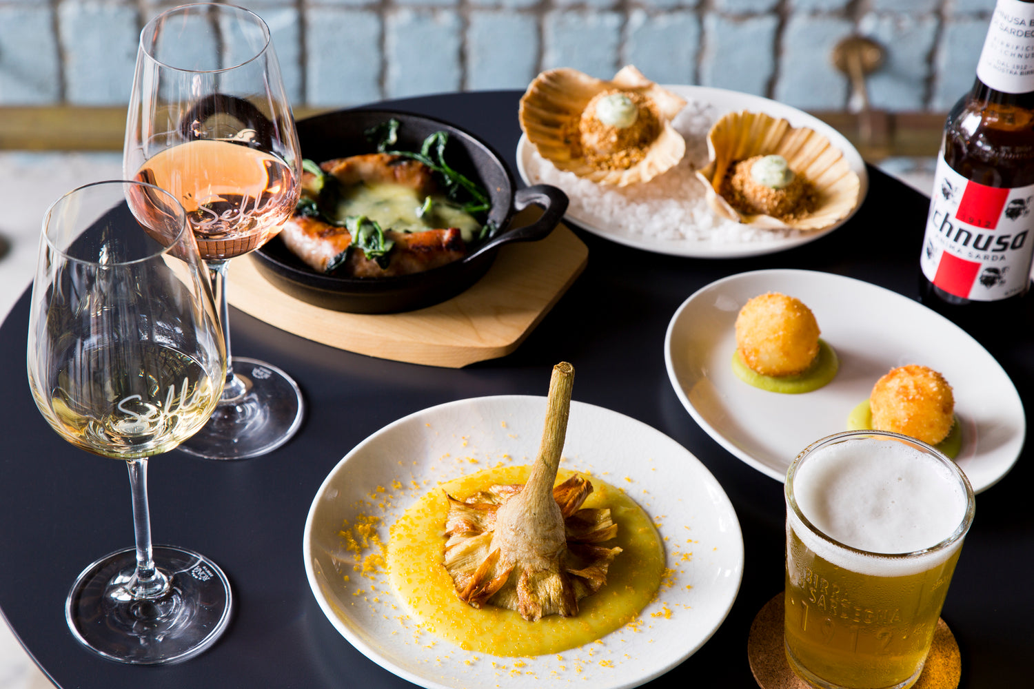 Think wine, cocktails, beers, Sardinian salami, pecorino, Spanish chips & Cantabrian anchovies..